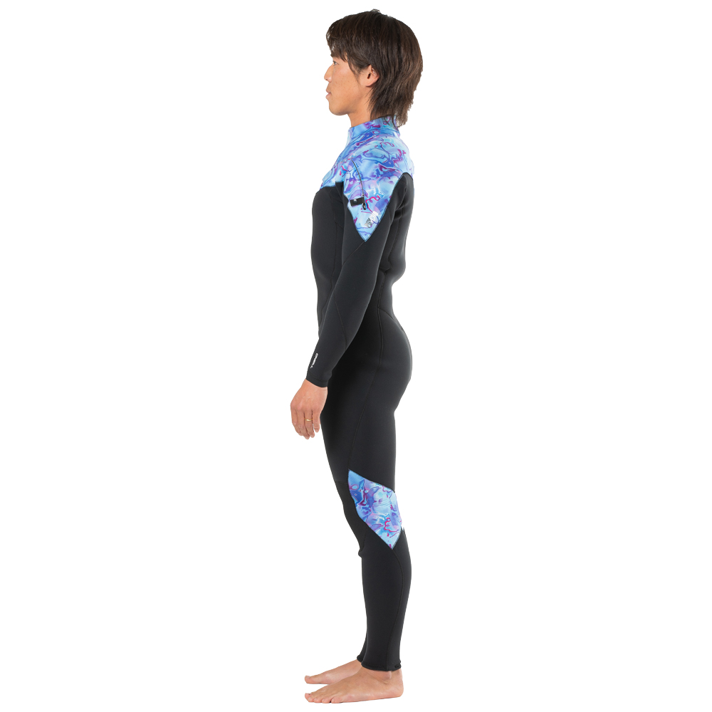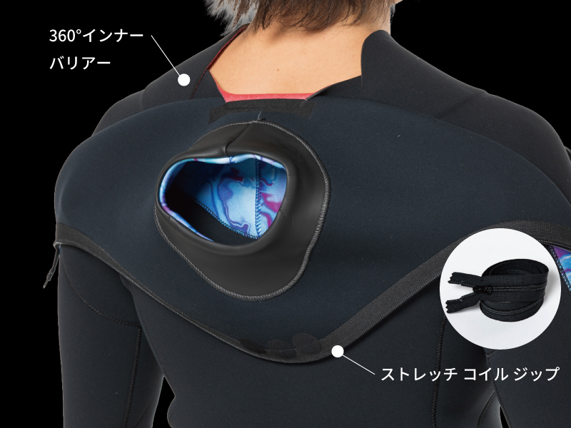 前面胸部にU字型ジッパーを配置し、着脱性と運動性を高次元で両立したロングセラーモデル。チームライダーのフィードバックをもとにジッパー位置を最適化し、肩まわりの可動を妨げない設計です。フロントには柔軟なストレッチコイルジッパーを配置し、体の動きに追従してパドリング時の負担を軽減。女性やシニアサーファーにも着脱しやすく、動きやすさにもこだわった1着です。