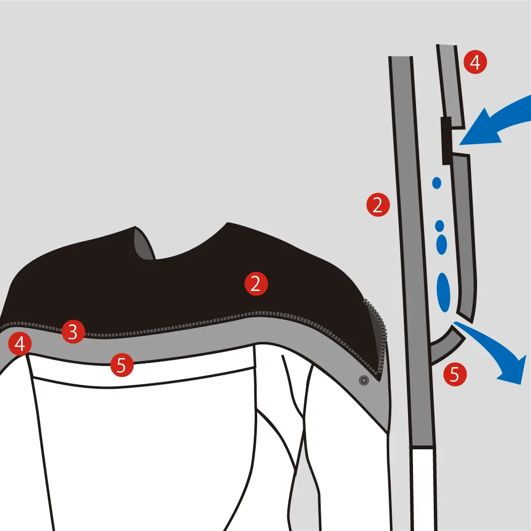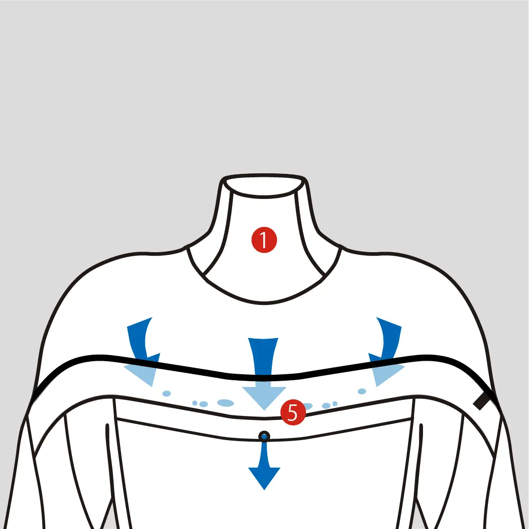 2.360°インナーバリアー:肩口を包み込み水の浸入を極限まで抑える。